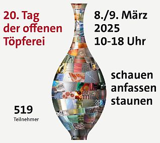 Am 13. und 14. März 2021 wird zum 16. Mal der Tag der offenen Töpferei stattfinden. Im ganzen Bundesgebiet nehmen zahlreiche Töpfereien teil, allein in Baden-Württemberg sind es über 50 Werkstätten, die ihre Türen für Besucher öffnen. Es erwarten Sie zahlreiche Vorführungen und Einblicke in die Arbeitsweise der verschiedenen Keramiker in Deutschland. Besuchen Sie die Webseite des Tags der offenen Töpferei und finden Sie die Töpfereien und Keramikateliers in Ihrem Bundesgebiet.