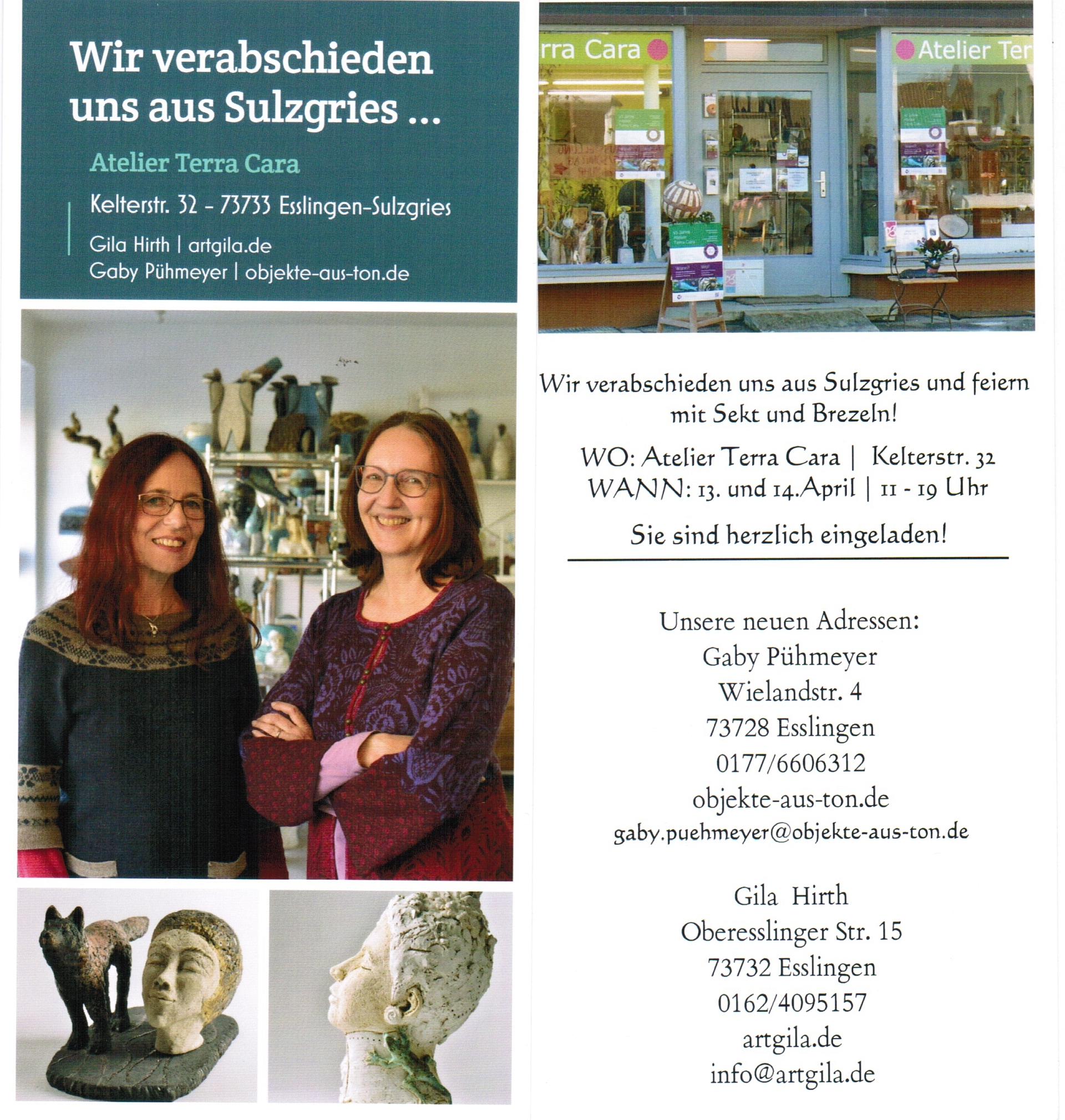 Liebe Freunde der Kunst, nach 15 Jahren im gemeinsamen Atelier Terra Cara trennen sich unsere Wege. Wir verabschieden uns aus Sulzgries und laden Sie/Euch recht herzlich zu einem Abschiedsbesuch bei Sekt und Brezeln ein. Gila