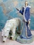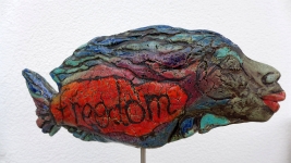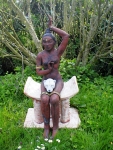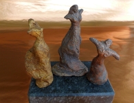 Spuren archaischer Symbole lassen Zeiten erahnen, in denen Priesterinnen stellvertretend für die Große Göttin tanzten. Lunarsymbolische Hörner auf dem Kopf verweisen auf die Mondgöttin. Sie sind Symbol einer räumlichen und zeitlichen Weltordnung und eines kosmischen Zusammenhangs zwischen Gestirnwandel und Daseinswandel als Gesetze der Natur und des Kosmos. In manchen Kirchen findet man Marien Figuren auf einer Mondsichel schwebend. Für die Figur des Gepards verwende ich verschiedene Ausführungen: flächig, als Relief und als Plastik. Hintergrund dieser Arbeiten sind unter anderem Ausgrabungsfunde in Tempelanlagen in Anatolien (beispielsweise in Catal Hüyük, ca. 8ooo Jahre alt). Ich liebe es, in jedem Land auf den Spuren prähistorischer Kulturen zu wandeln, in Höhlen, Ausgrabungen, Naturdenkmälern oder Museen. Auf Wandbildern und in Gestalt von Tonfiguren wurde dort die Verbindung zwischen Gepard und Göttin dargestellt; als bedeutendes Symbol für Mütterlichkeit und Kraft. Auch in der Antike gab es Abbildungen von Isis auf Geparden oder Leoparden stehend. Ebenso begleiten Bären und Wölfe mythische Rollen in der Menschheitsgeschichte bis heute als Schamanen und Totemtiere. Kleine Idole verweisen auf magische Rituale vergangener Zeiten. Die Beziehungen zwischen Mensch, Tier, Natur und Kosmos sind in der modernen Gesellschaft fast unbedeutend geworden. Doch die Natur meldet sich zurück und stellt die Menschheit vor große Herausforderungen. Dies spiegelt sich in einigen meiner Objekte wider und wirft Fragen auf. An das einstige Wissen zu erinnern, ist der innerste Antrieb meines künstlerischen Schaffens. Das Eintauchen in alte Kulturen überall auf der Welt gibt mir zugleich Inspiration und Hoffnung. |